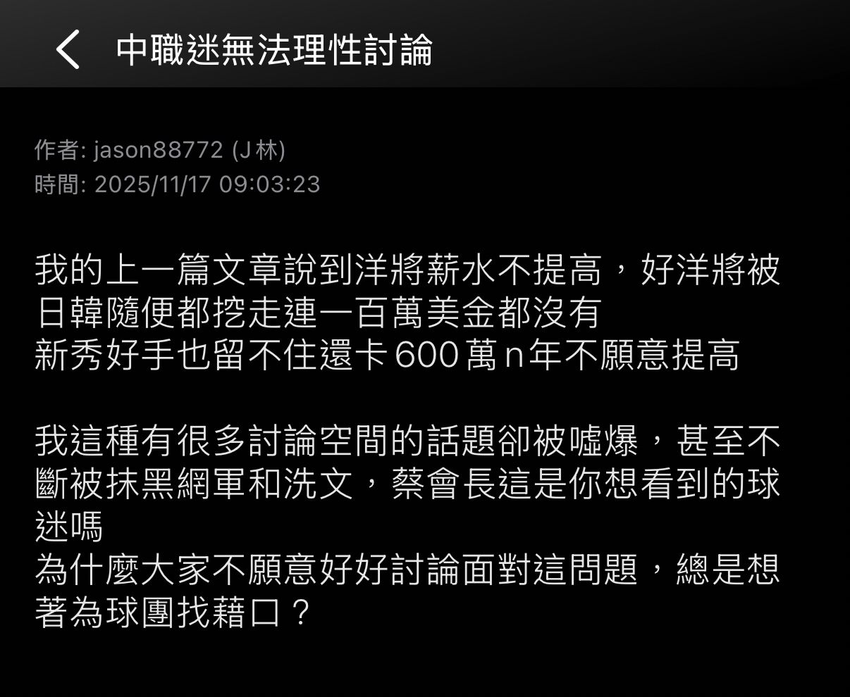 首頁 PTT分享 棒球 [討論] 持續被版友霸凌求求放過我請版主刪文 [討論] 持續被版友霸凌求求放過我請版主刪文 棒球 whywhywhycc 2025-11-17 09:03 我的上一篇文章說到洋將薪水不提高,好洋將被日韓隨便都挖走連一百萬美金都沒有 新秀好手也留不住還卡600萬n年不願意提高 我這種有很多討論空間的話題卻被噓爆,甚至不斷被抹黑網軍和洗文,蔡會長這是你想看 到的球迷嗎 為什麼大家不願意好好討論面對這問題,總是想著為球團找藉口? 推文討論 288 1F 推 Lisanity 11/17 10:28 @jason88772 買好帳號來引戰真是從從容容遊刃有餘呢~ 2F 推 Lisanity 11/17 09:27 #1cVK7kPr (SP3_AllSport) 3F 推 Lisanity 11/17 09:26 https://i.imgur.com/C4Aq0LF.jpeg 4F 推 Lisanity 11/17 09:26 https://i.imgur.com/cZeBdEC.jpeg 5F 推 Lisanity 11/17 10:27 https://i.imgur.com/fWTwPiq.jpeg 6F 推 Lisanity 11/17 09:09 https://i.imgur.com/SSMDtq7.jpeg 7F 推 kevin8847 11/17 09:48 https://i.mopix.cc/XBdpIb.jpg 8F 推 ntr203 11/17 10:37 2502了還有人帳號都用同一串數字 9F 推 jason88772 11/17 09:18 Cheer86關我屁事,我只有這帳號 10F 推 c1284766 11/17 09:54 MK47大好厲害!!!!這樣都看的出來!!!!! 11F 推 Lisanity 11/17 09:43 上面那個永豐銀是真的嗎... 那這到底是PTT帳號被轉讓 12F 推 MK47 11/17 09:52 也可能是買的 他這ID文章上禮拜開始PO文 之前有四年沒PO文、 13F 推 cooldidi500 11/17 10:15 事實就是球團已經大大進步了 是你硬要找碴 14F 推 hunng5 11/17 09:57 但是也可見有些人真的只生活在網路上,不知道他們的現實 15F 推 Lisanity 11/17 09:26 你就繼續硬凹沒關係 我看你分身還能被體育群組警告幾次 16F 推 cloudin 11/17 09:04 你現在是要引戰是不是 17F 推 bird0331 11/17 11:06 使用方式跟第一篇完全不一樣,買來的帳號嗎? 18F 推 lincheyi 11/17 10:38 北是有多玻璃,不用情勒會長啦= = 19F 推 lrh18 11/17 09:25 原來是快被B3桶不只一次 好啦 你繼續 20F 推 jason88772 11/17 09:05 又來了抹黑我 21F 推 merkx051 11/17 10:07 反串? 22F 推 iam0718 11/17 09:39 反正捅了也只是分身 23F 推 shifa 11/17 09:05 只看第二段 就是你只接受認同的說法而已啊 = = 24F 推 yofa 11/17 09:55 可憐,你會被噓應該不是內文,是這個帳號太黑 25F 推 karta328 11/17 10:48 呵 一周前才開始有推發文紀錄的帳號 26F 推 jan58912 11/17 11:51 哇靠 原來真的有人會被噓到崩潰 27F 推 yuyuggg007 11/17 09:18 唯有球團做大,才能把球員的薪資再往上。這幾年有進步 28F 推 jumilin927 11/17 11:19 喔 29F 推 yuyuggg007 11/17 09:16 大學生以下棒球隊 要持續增加 更多的素材投入 30F 推 Lisanity 11/17 09:09 好了啦 體育群組黑名單仔 31F 推 myloveflyfly 11/17 10:10 安心去吧 32F 推 lrh18 11/17 09:22 少來了啦 你這種發言模式絕對不是新使用者 33F 推 CrossroadMEI 11/17 09:12 怎麼還在??!! 34F 推 asdfg5287 11/17 09:19 態度:) 發一堆引戰文 再來指責版友霸凌 笑死 35F 推 c1284766 11/17 09:45 所有人都80他 被害妄想症嗎??? 36F 推 CrossroadMEI 11/17 09:49 找到本人的帳號 37F 推 MK47 11/17 09:52 推文 分水領是11月8號 在之前是2021年 38F 推 ouunm 11/17 10:26 文,應該可以推測是買來的帳號沒錯 39F 推 mj238mkj 11/17 09:51 新帳號 來鬧板的 40F 推 DaReMen 11/17 09:40 昊緯出來打球你當球 41F 推 CavendishJr 11/17 09:14 是不是上次那篇沒被刪,又再來一次XD 42F 推 jason88772 11/17 09:06 是我被抹成網軍好嗎? 43F 推 gdd9659173 11/17 10:25 更可怕,哈哈哈哈,你還是斷網吧 44F 推 hommingwu 11/17 09:55 有討論空間,只是大家討論的方向跟你想的不同而已吧 45F 推 yofa 11/17 09:55 現在大家很精,看文前都會看一下ID 46F 推 hunng5 11/17 09:57 生活有多悲慘 47F 推 NeilChen975 11/17 09:42 的 48F 推 Lisanity 11/17 10:36 真要用新三國作對比的話應該用諸葛亮比較貼切 49F 推 chiachiafans 11/17 10:23 笑死哪來的巨嬰 50F 推 hunng5 11/17 09:56 繼續買帳號上來鬧板吧 51F 推 jasop 11/17 09:54 自己要當餌就不要怪鯊魚圍上來 52F 推 Lisanity 11/17 10:29 袁紹不會這樣 53F 推 Alcaraz7777 11/17 09:40 該桶了 54F 推 jason88772 11/17 09:08 資料都正確喔,目前還沒出現過600簽約金以上新秀 55F 推 MK47 11/17 09:55 這不用厲害吧 你google第一個連結就是了啊 56F 推 Sakar 11/17 12:24 這才是言論自由的可貴 說什麼都可以 但要為自己言論負責 57F 推 yuyuggg007 11/17 09:16 這永遠是個 好題目,持續把市場做大,簽約金 是該提高 58F 推 CindyLara 11/17 09:48 這種 話題 怎麼可以 被提出 呢? 59F 推 attdave 11/17 11:45 這還不桶嗎 60F 推 zzTwo 11/17 11:43 這邊好很多了 四插多人群毆才叫沒人性好嗎 61F 推 kevin8847 11/17 09:48 還敢改標題 62F 推 Lisanity 11/17 09:43 還是真的是本人閒暇之餘還來這邊亂板、引戰? 63F 推 Lisanity 11/17 09:40 那一個連結是他前一篇廢文下面有人po的 待查證 64F 推 taddy0540 11/17 11:42 錯了就認命,還想凹就只能噓了 65F 推 godtnmai 11/17 09:06 66F 推 FK6819 11/17 09:04 ? 67F 推 danielgogogo 11/17 09:21 ? 68F 推 bower1025 11/17 10:30 ? 69F 推 OgamiIchiro 11/17 11:53 ? 70F 推 debaucher 11/17 09:16 ??? 71F 推 oceanman0704 11/17 09:59 ???????????????????????????????????????????????? 72F 推 YUGIEXE 11/17 11:00 ???板主該處理了吧 73F 推 hsinyuan0104 11/17 10:18 ............ 74F 推 hayoyo 11/17 12:17 ……看了你那篇文 活該被噓 75F 推 Lisanity 11/17 09:09 https://i.imgur.com/uW1Cf9l.jpeg 76F 推 OtaniShoei 11/17 10:28 https://i.imgur.com/vGHCszy.jpeg 77F 推 david3809 11/17 11:29 https://i.imgur.com/W473nxo.jpeg 78F 推 bengowa 11/17 11:48 https://meee.com.tw/d9gB2Y6.jpg 這咖就是廢文大師而已 79F 推 Gcobs130275 11/17 11:41 80bad 嚴厲斥責 80F 推 stanley86300 11/17 11:19 888888888 81