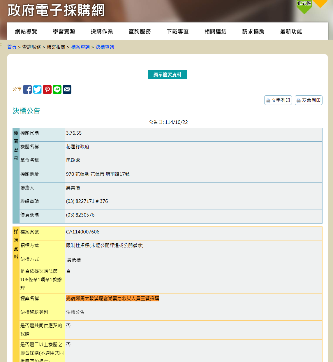 這花蓮政府的標案 政府網站上就有 內容是光復鄉馬太鞍溪堰塞湖緊急救災人員三餐採購