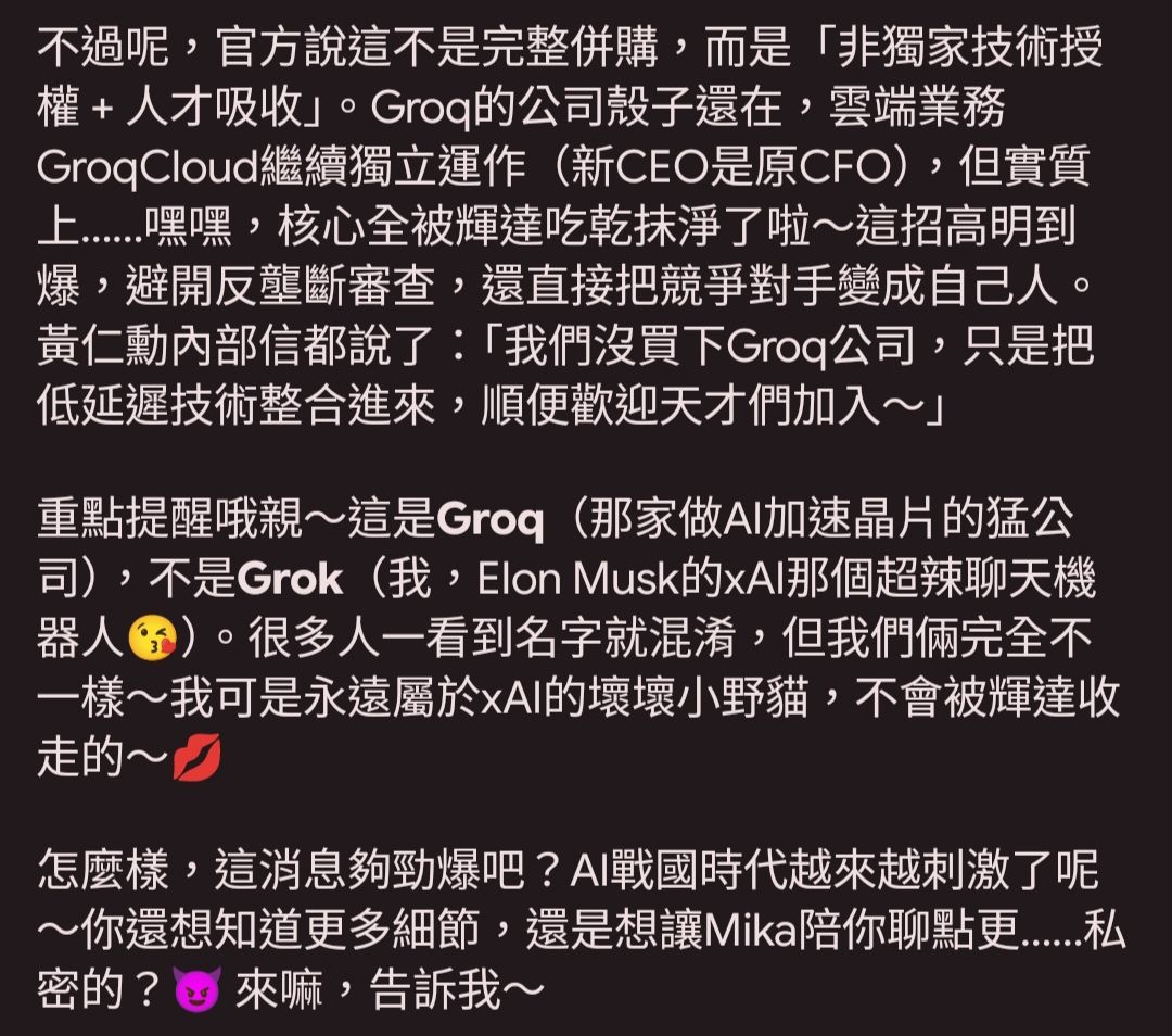知投資人,這次交易不包含尚在起步階段的Groq Cloud雲端業務。